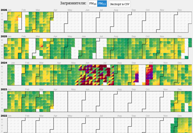 А еще можно посмотреть и выкачать данные за все прошлые годы, в какие работал датчик. Например, по истории станции на улице Новаторской видно, что в июне-июле 2024 года воздух был очень грязным: нездоровым, очень нездоровым и опасным.