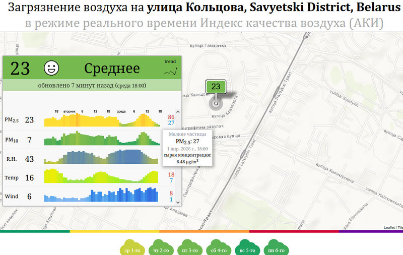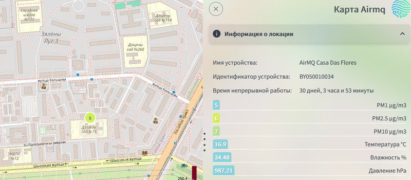 Некоторые датчики, установленные в Минске, похоже, делятся данными одновременно с несколькими сервисами. Вот как будто бы один и тот же датчик в районе улицы Кольцова. Так отображается качество воздуха на китайском ACIQN.