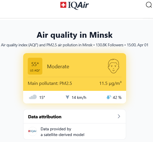 В мире есть и другие похожие сервисы, которые покажут вам состояние и качество воздуха в Беларуси. Но будьте внимательны: некоторые из них используют лишь усредненные данные. Например, швейцарский сервис IQAir показывает вот такую картинку по Минску (содержание ТЧ-2.5 в среднем 11,5 микрограмм на кубометр, желтый уровень, что значительно выше, чем выдают реально установленные в Минске датчики от других сервисов). И компания честно предупреждает: это расчетные данные, смоделированные на основе информации со спутников.