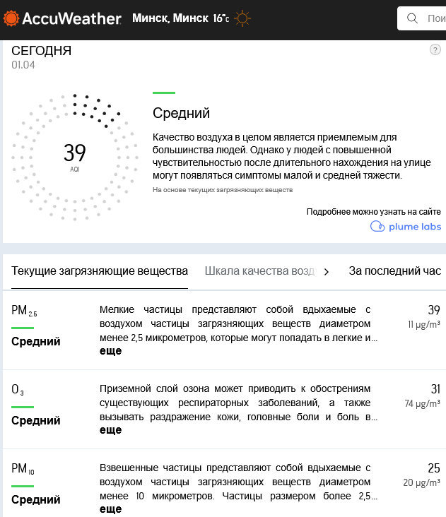 Или вот популярный сайт AccuWeather, который в своем красивом графике использует данные от PlumeLabs, а тот, в свою очередь, получает их от спутниковой программы Copernicus, а реальной, наземной системы сбора информации в Беларуси у них нет.