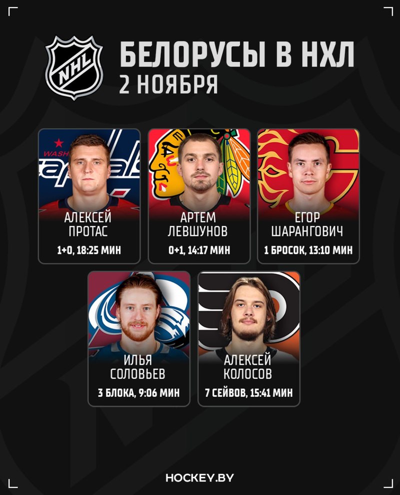 Федерация хоккея Беларуси сообщает: 1 ноября в регулярном чемпионате НХЛ в течение одного игрового дня на лед впервые в истории вышли 5 хоккеистов-белорусов.