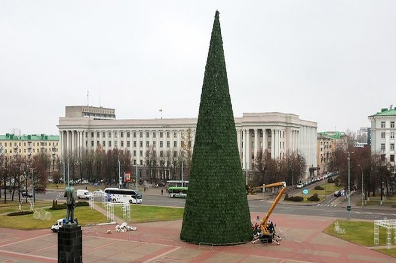 Сначала специалисты собирают металлический каркас, на котором после закрепляют искусственные зеленые лапки. Монтаж планируют закончить сегодня, сообщает БЕЛТА.