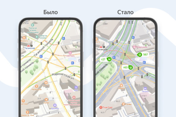 Все дороги в сервисе поменяли цвет на серый и получили детальную разметку — раньше она была доступна только водителям в режиме навигации, сообщила компания. Подземные переходы выделены фиолетовым и «просвечивают» через дорогу.