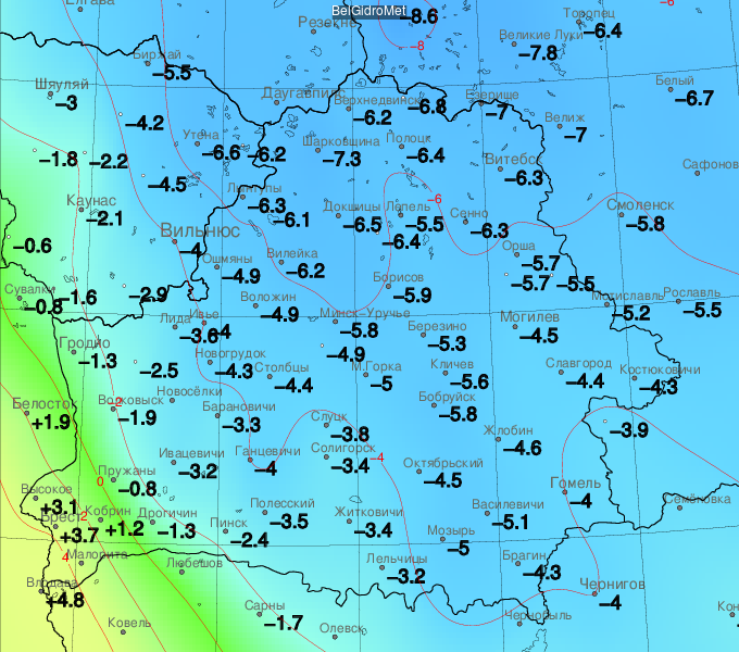 Минимальная температура была зафиксирована в Езерище (-7°С) и Шарковщине (-7,3°С).