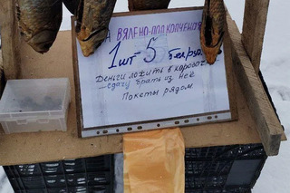 Белорус продает вяленую рыбу у замка в Коссово через кассу самообслуживания. Продавца нет − сдачу берите сами
